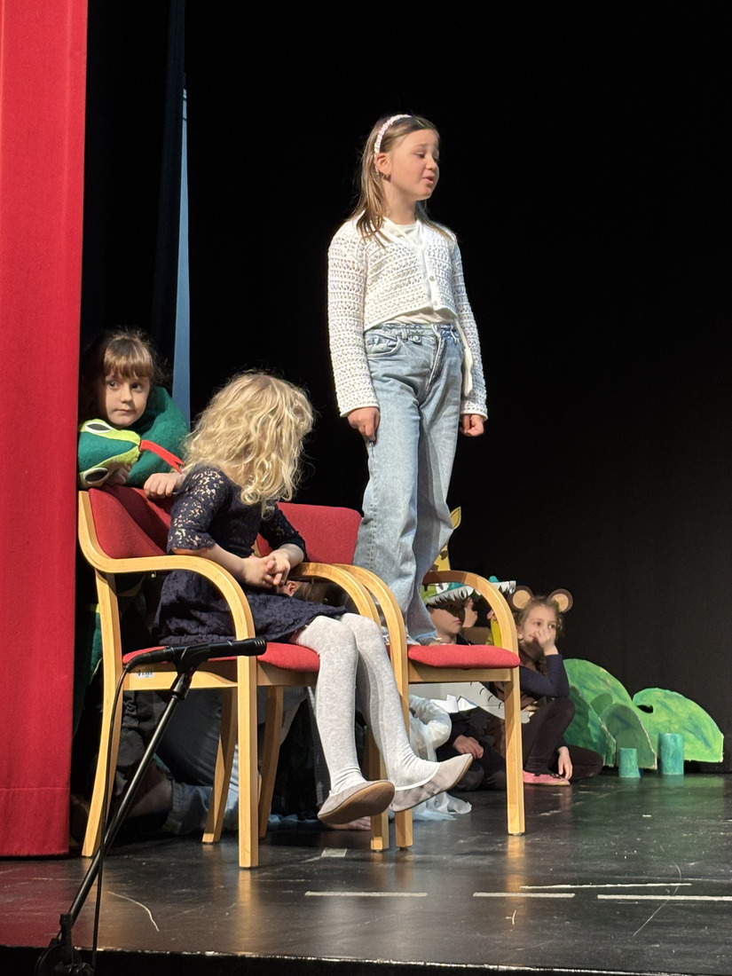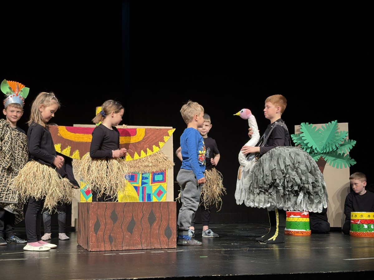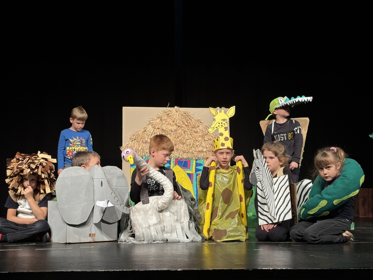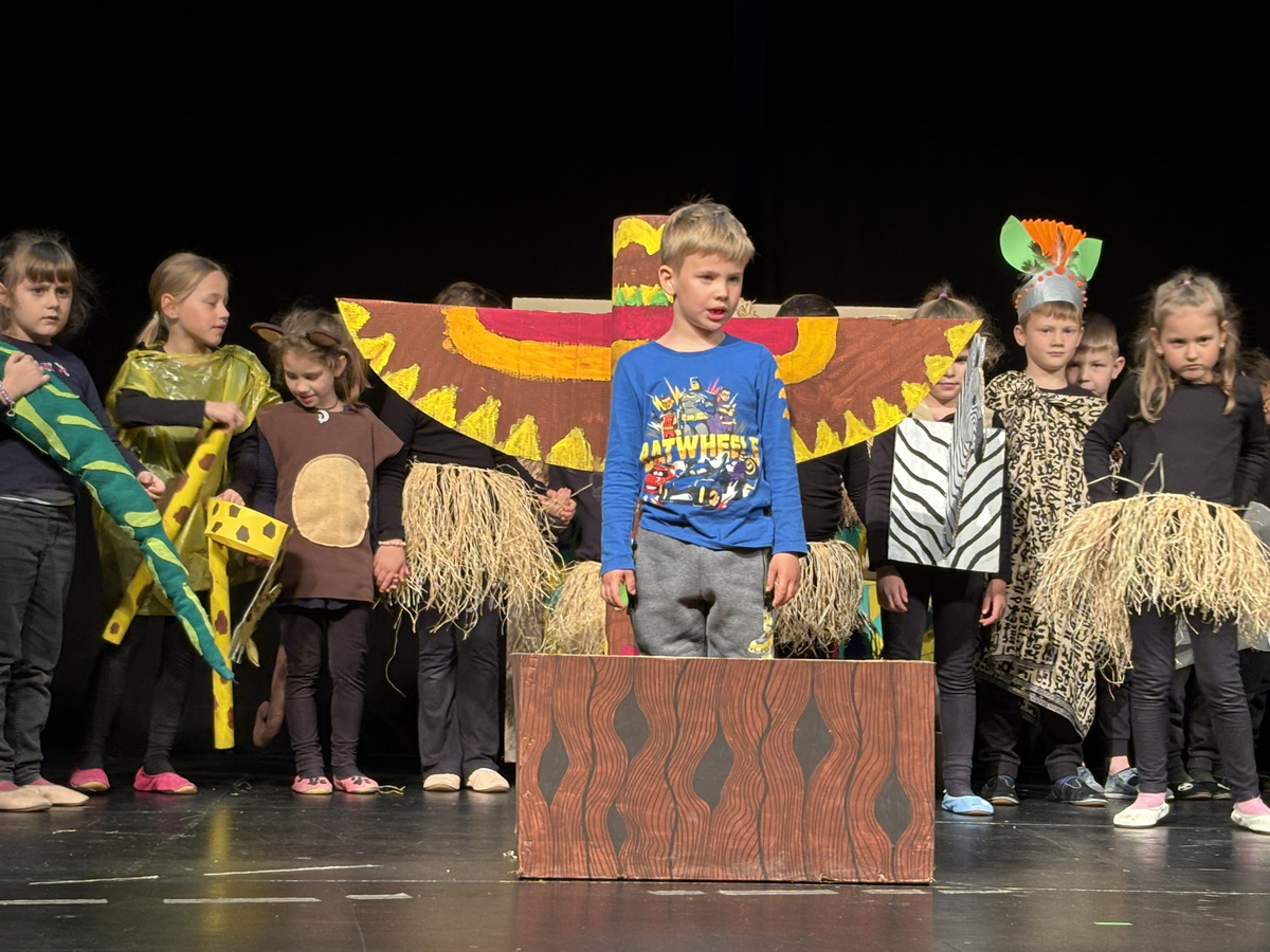 Na srečanju se je odlično prestavila tudi številčna skupina prvošolcev Osnovne šole dr. Pavla Lunačka Šentrupert. Občinstvo so doživeto popeljali v razgiban svet predstave Juri Muri v Afriki, nastale po znani pesnitvi Toneta Pavčka. Zgodba pripoveduje o radovednem in navihanem dečku Juriju Muriju, ki se odpravi na razburljivo potovanje v Afriko, kjer spoznava drugačen svet, nove prijatelje ter nenavadne živali, ob tem pa doživlja številne zabavne in poučne dogodivščine. Predstava skozi humor, glasbo in živahno igro odpira teme sprejemanja drugačnosti, prijateljstva ter pomena doma in družine. Prvošolci so s suvereno igro, razigranimi liki, barvitimi kostumi in domiselno scenografijo gledalce popeljali v svet domišljije. Mentorici predstave sta Mojca Vidmar in Sandra Rugelj. Skupini je v pripravah na srečanje pomagala nekdanja mentorica Justina Zupančič.