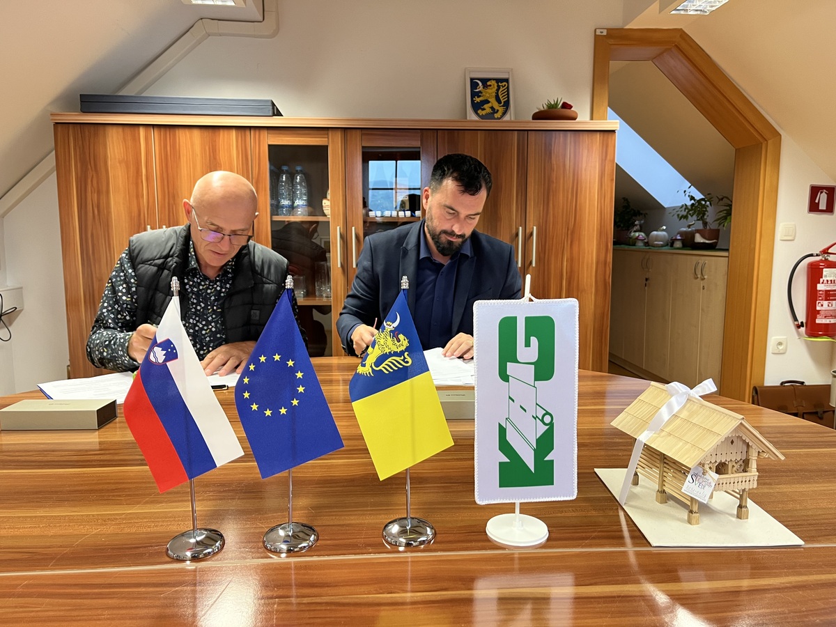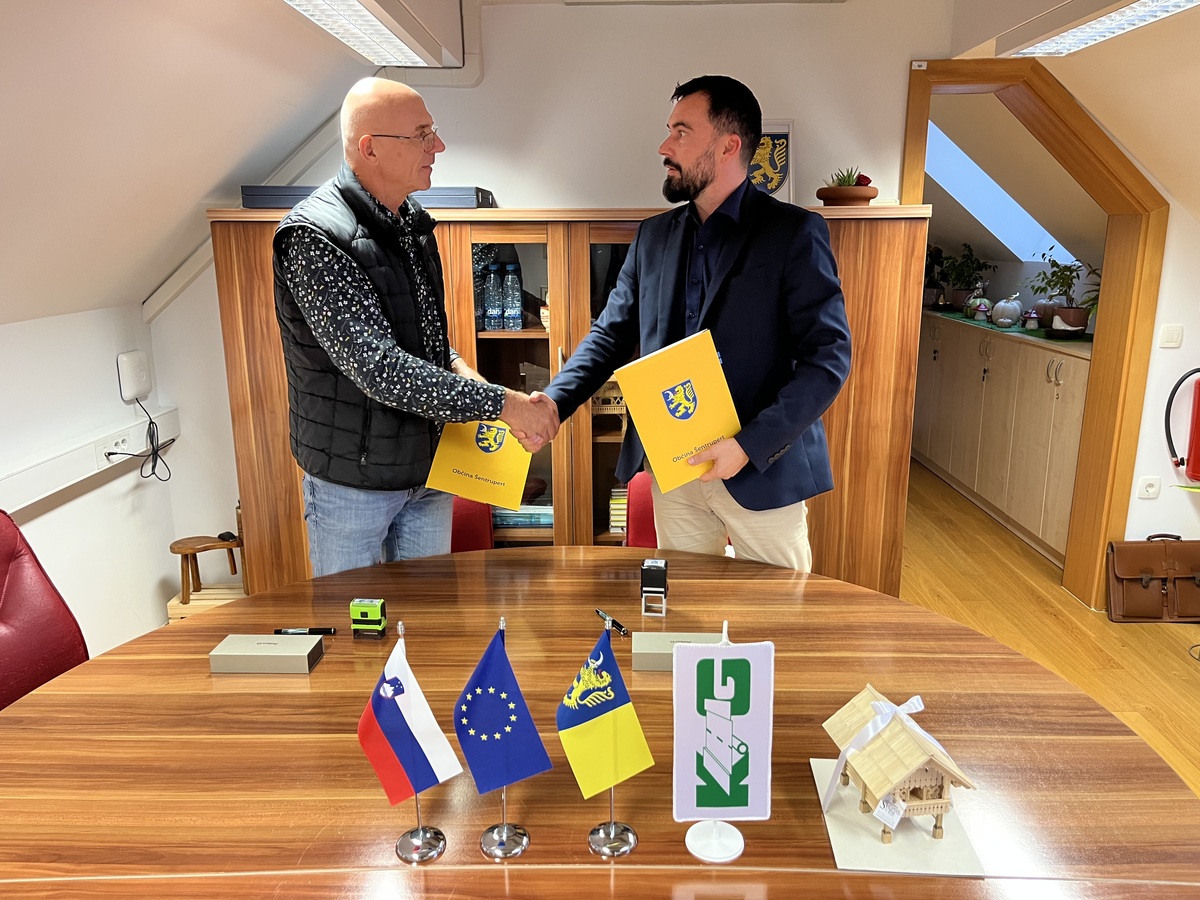 Župan Občine Šentrupert Tomaž Ramovš in direktor podjetja Komunalne gradnje d.o.o. Viktor Dolinšek sta podpisala gradbeno pogodbo za obnovo športnega igrišča pri OŠ dr. Pavla Lunačka Šentrupert.