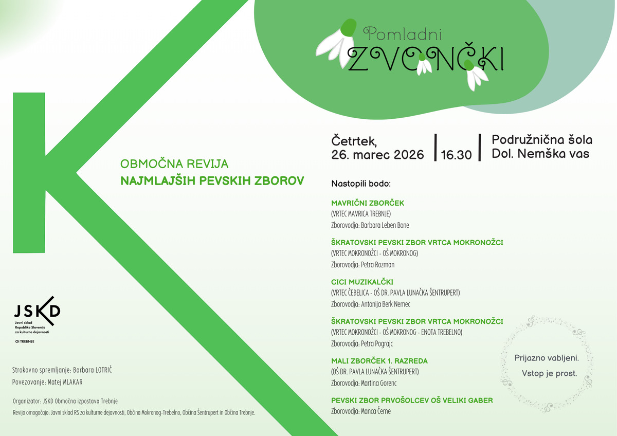 Prisrčno vabljeni na Območno revijo najmlajših pevskih zborov Pomladni zvončki, ki se bo odvila v četrtek, 26. marca 2026, ob 16.30 v Športni dvorani PŠ Dolenja Nemška vas.