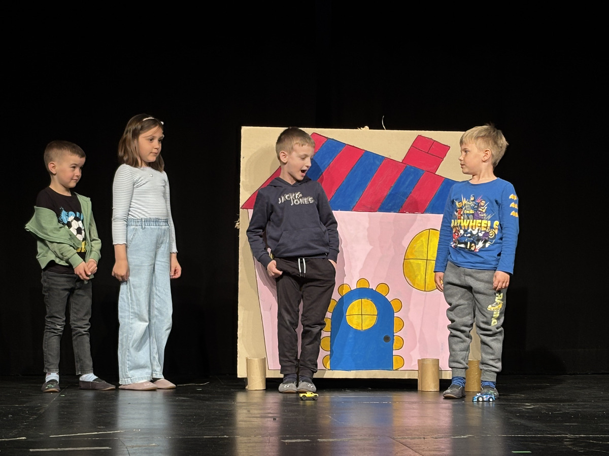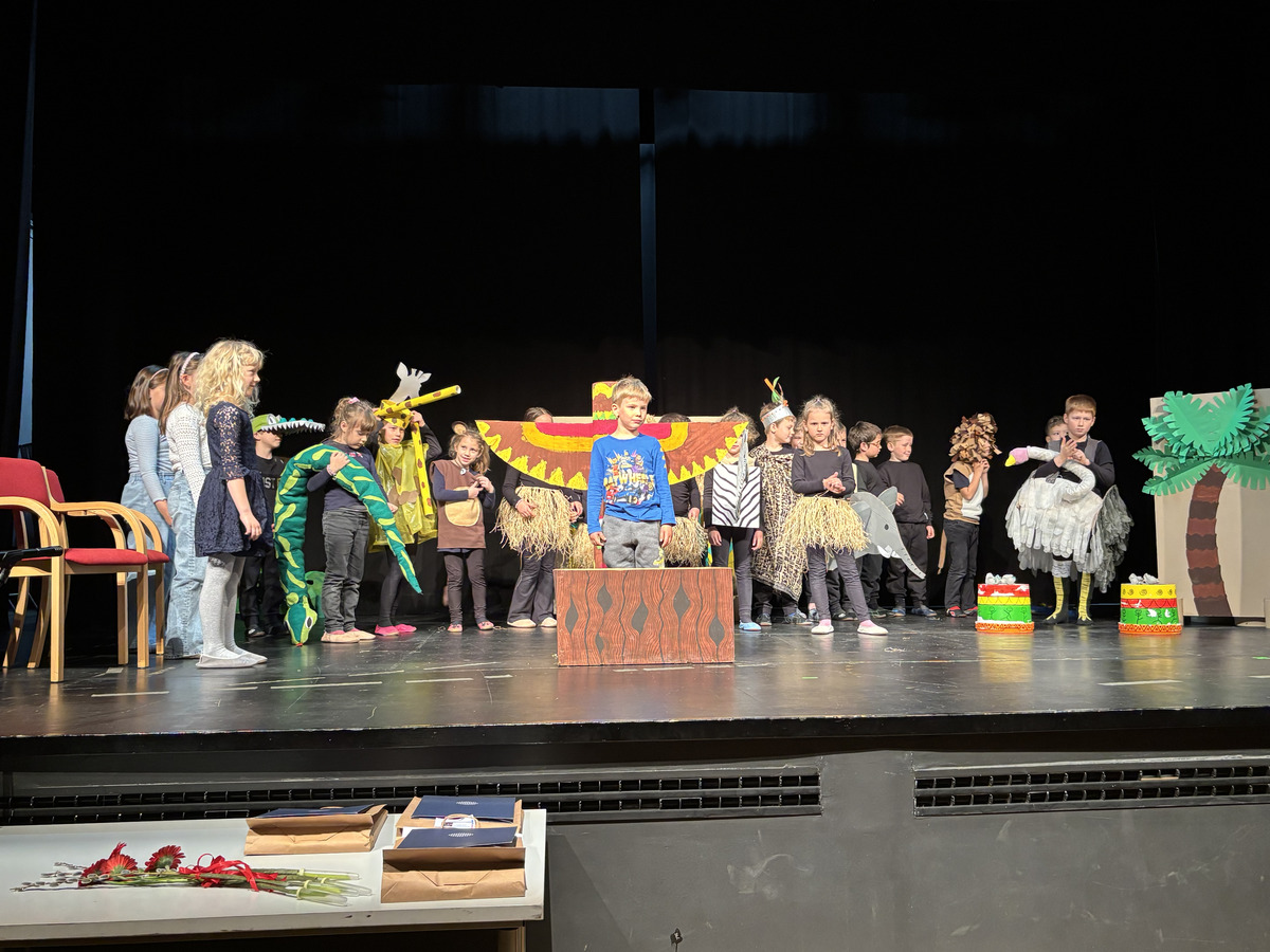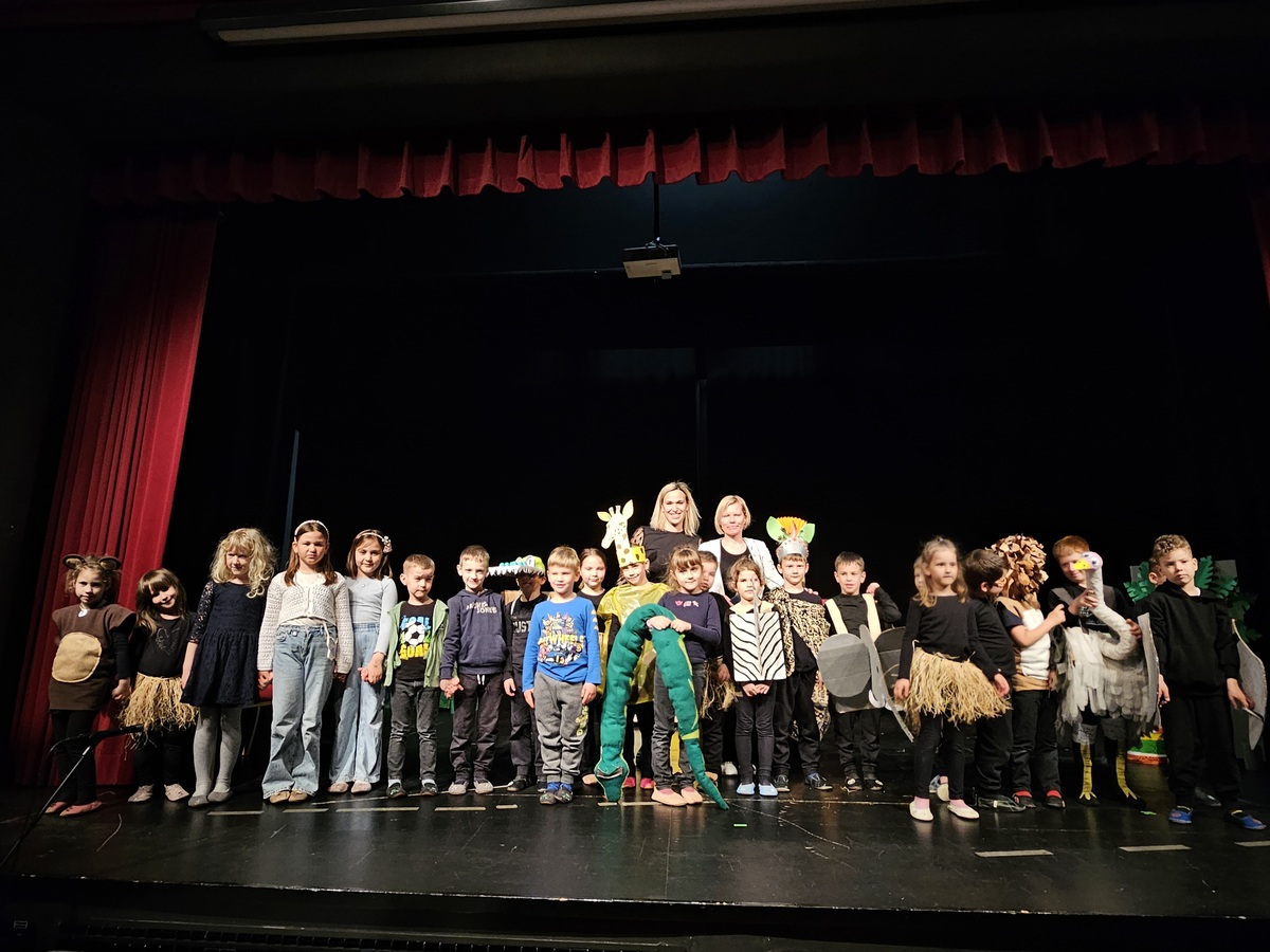Na srečanju se je odlično prestavila tudi številčna skupina prvošolcev Osnovne šole dr. Pavla Lunačka Šentrupert. Občinstvo so doživeto popeljali v razgiban svet predstave Juri Muri v Afriki, nastale po znani pesnitvi Toneta Pavčka. Zgodba pripoveduje o radovednem in navihanem dečku Juriju Muriju, ki se odpravi na razburljivo potovanje v Afriko, kjer spoznava drugačen svet, nove prijatelje ter nenavadne živali, ob tem pa doživlja številne zabavne in poučne dogodivščine. Predstava skozi humor, glasbo in živahno igro odpira teme sprejemanja drugačnosti, prijateljstva ter pomena doma in družine. Prvošolci so s suvereno igro, razigranimi liki, barvitimi kostumi in domiselno scenografijo gledalce popeljali v svet domišljije. Mentorici predstave sta Mojca Vidmar in Sandra Rugelj. Skupini je v pripravah na srečanje pomagala nekdanja mentorica Justina Zupančič.