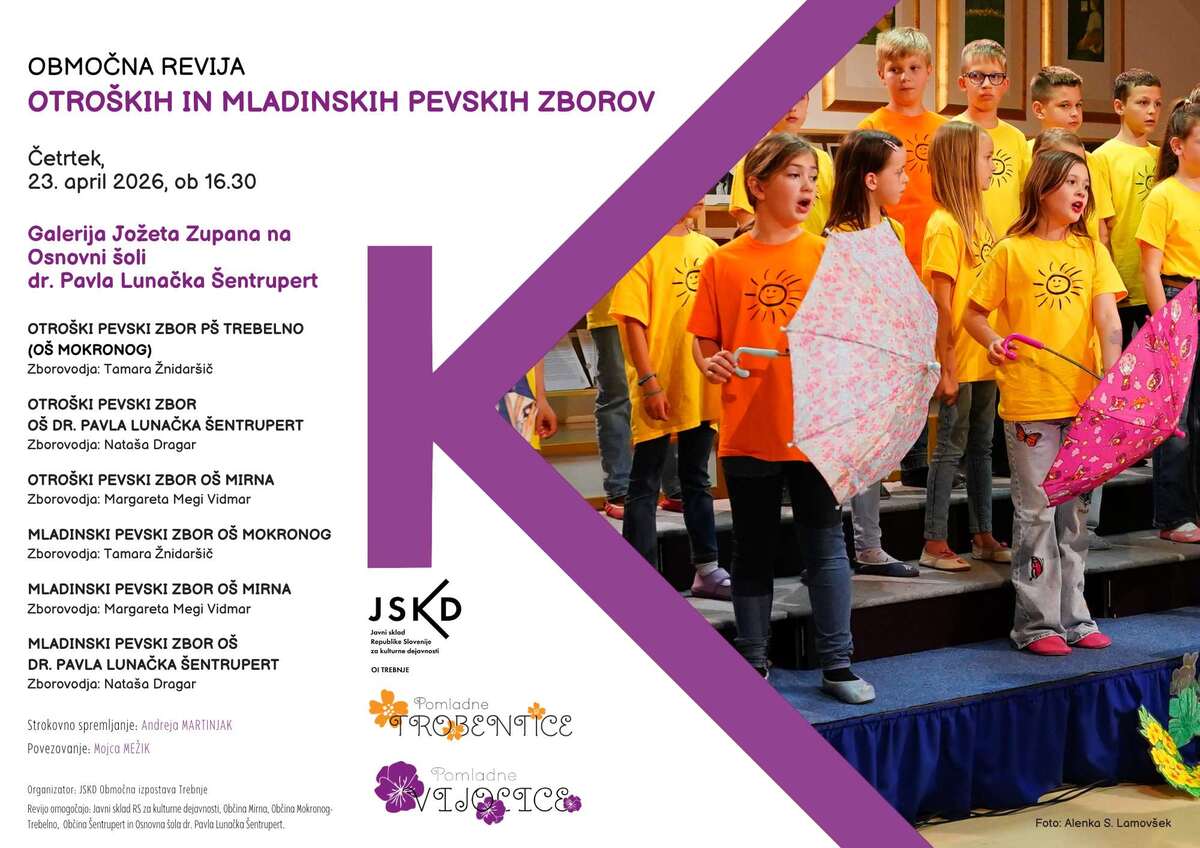 V četrtek 23. aprila 2026, organizira JSKD OI Trebnje v Šentrupertu območno revijo otroških in mladinskih pevskih zborov, v Galeriji Jožeta Zupana, ob 16.30. Nastopilo bo šest pevskih zborov.