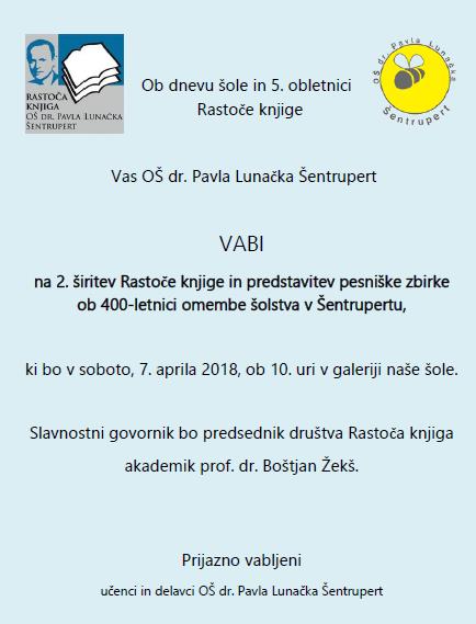 Ob dnevu šole in 5. obletnici Rastoče knjige OŠ dr. Pavla Lunačka Šentrupert vas vabimo na 2. širitev Rastoče knjige in predstavitev pesniške zbirke ob 400-letnici omembe šolstva v Šentrupertu, ki bo v soboto, 7. aprila 2018, ob 10. uri v galeriji naše šole.