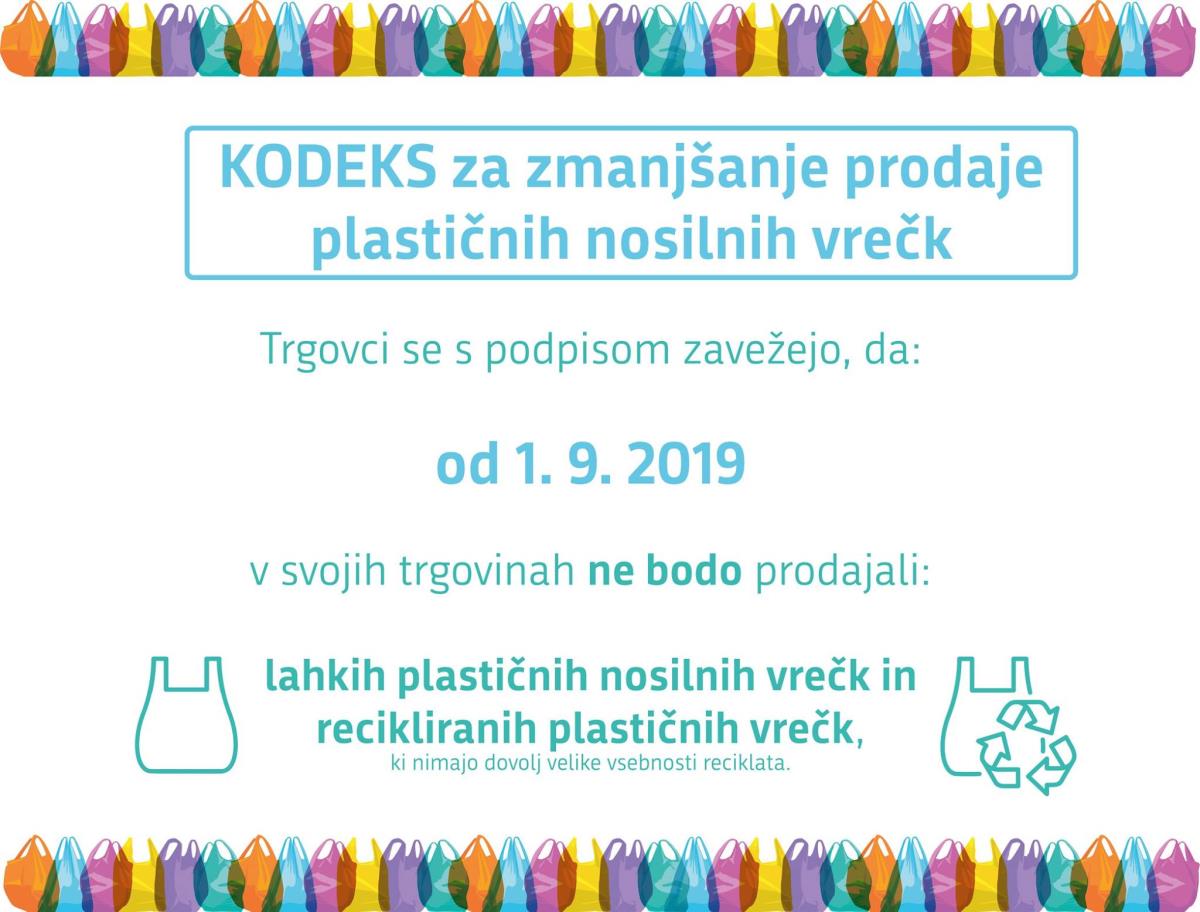 ??1. septembra bo začel veljati kodeks za zmanjšanje prodaje plastičnih nosilnih vrečk. ?? Do 25. avgusta je h kodeksu pristopilo že 33 slovenskih podjetij.
