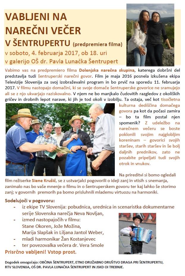 NAREČNI VEČER v Šentrupertu (predpremiera filma), 4.2.2017, ob 18. uri